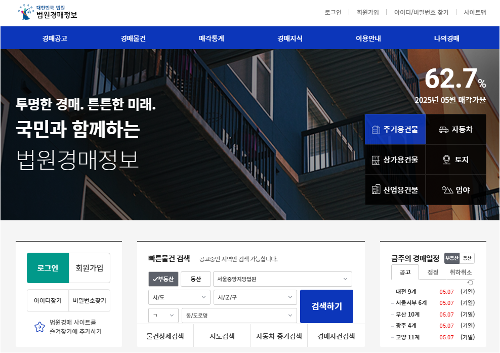 이 사이트는 별도의 회원가입 없이도 이용이 가능합니다. 누구든지 접속만 하면 경매 물건의 목록은 물론, 사건번호, 소재지, 감정가, 입찰기일 등 핵심 정보를 확인할 수 있습니다. 다만, 등기사항 증명서 등 일부 세부 자료는 공인인증서(공동인증서)가 필요할 수 있습니다.